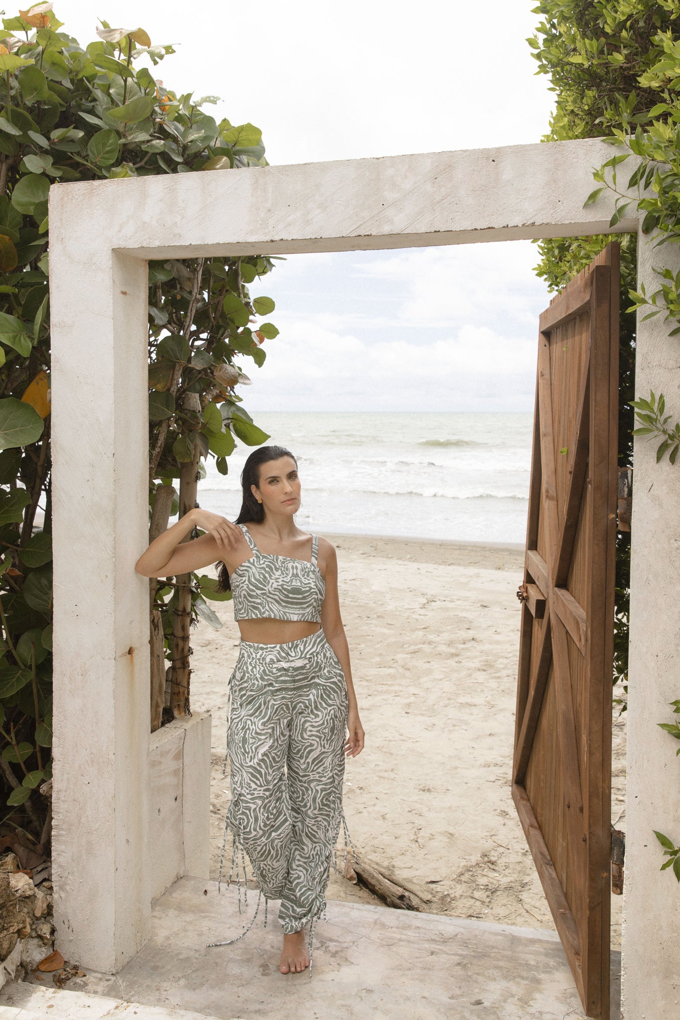 Pantalón de tiro alto con corte recto y ajuste cómodo con cierre de broche y cremallera en la parte delantera. Presenta bolsillos amplios con solapas en los laterales y un diseño con cintas ajustables en las piernas para un look versátil y moderno.