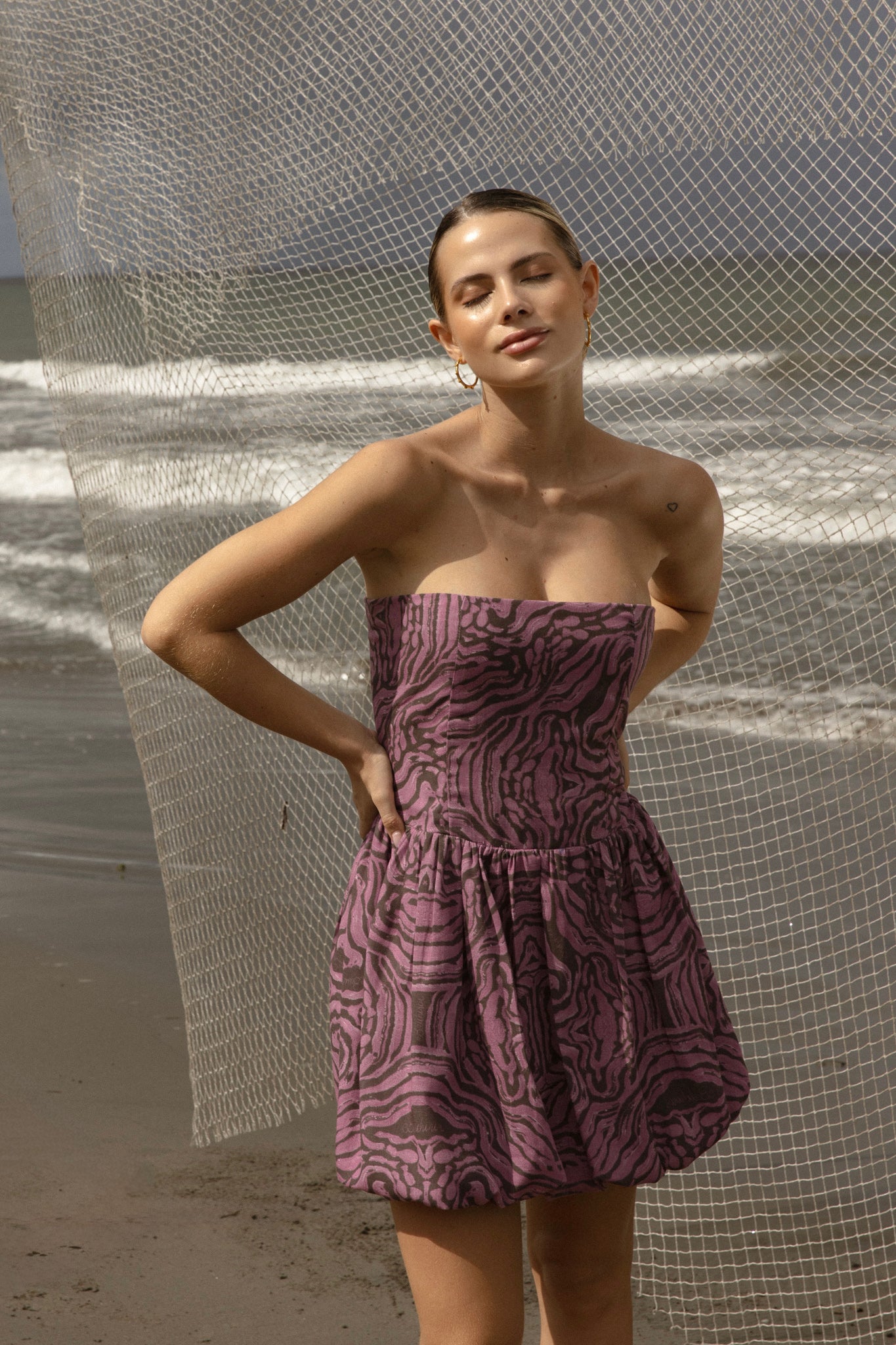 Vestido corto strapless con silueta entallada en el busto y falda tipo globo. Confeccionado en lino algodón estampado, incluye un detalle de smocking en la espalda que garantiza un ajuste perfecto.