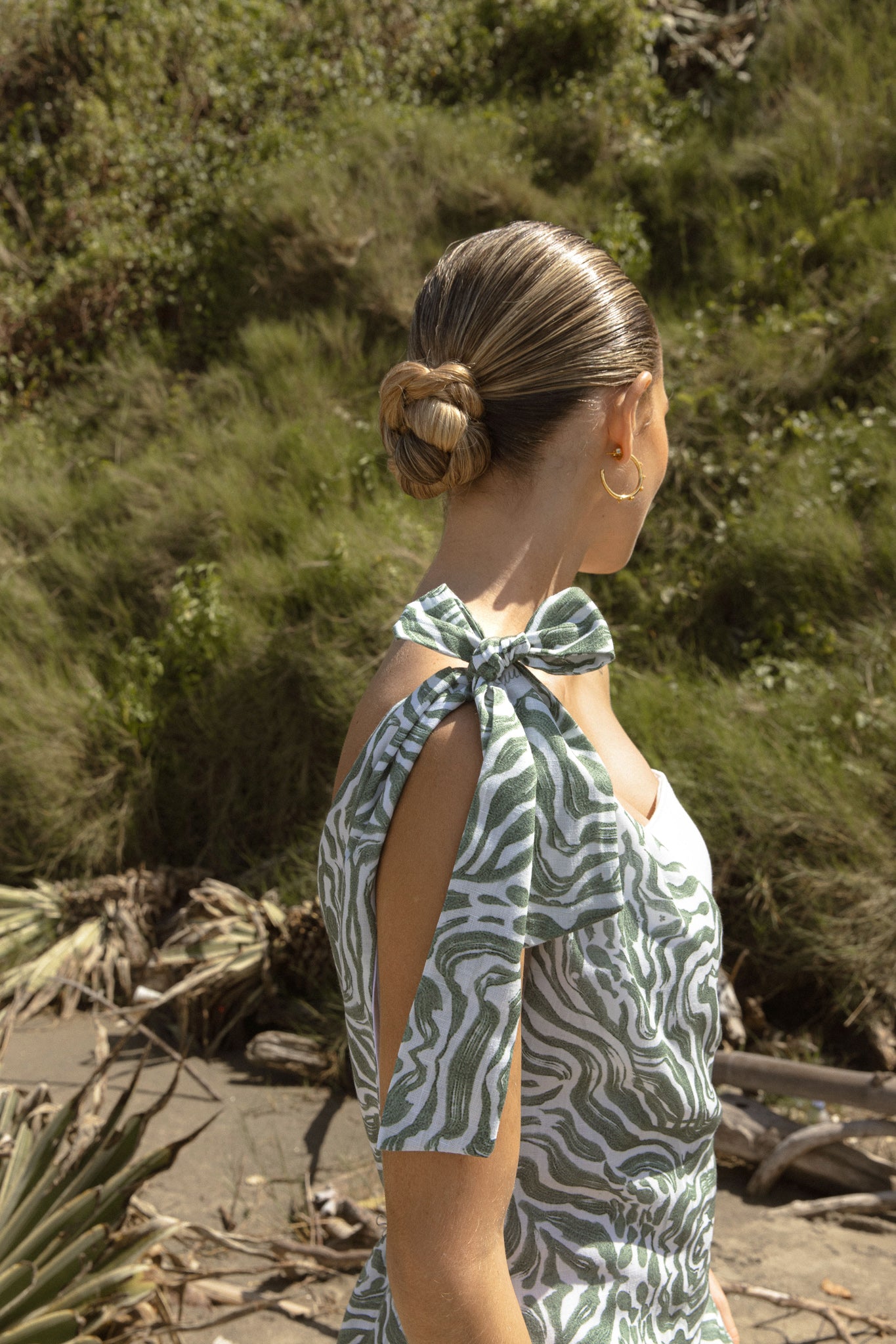Vestido corto en lino algodón con diseño asimétrico y detalle de lazo en el hombro, acompañado de un top independiente con detalle de smocking en la parte posterior para un ajuste perfecto.