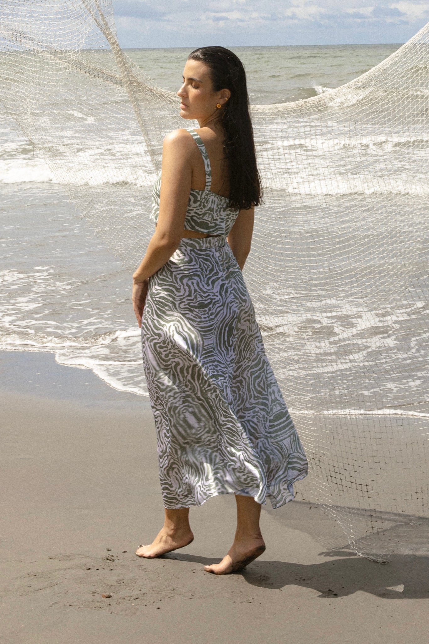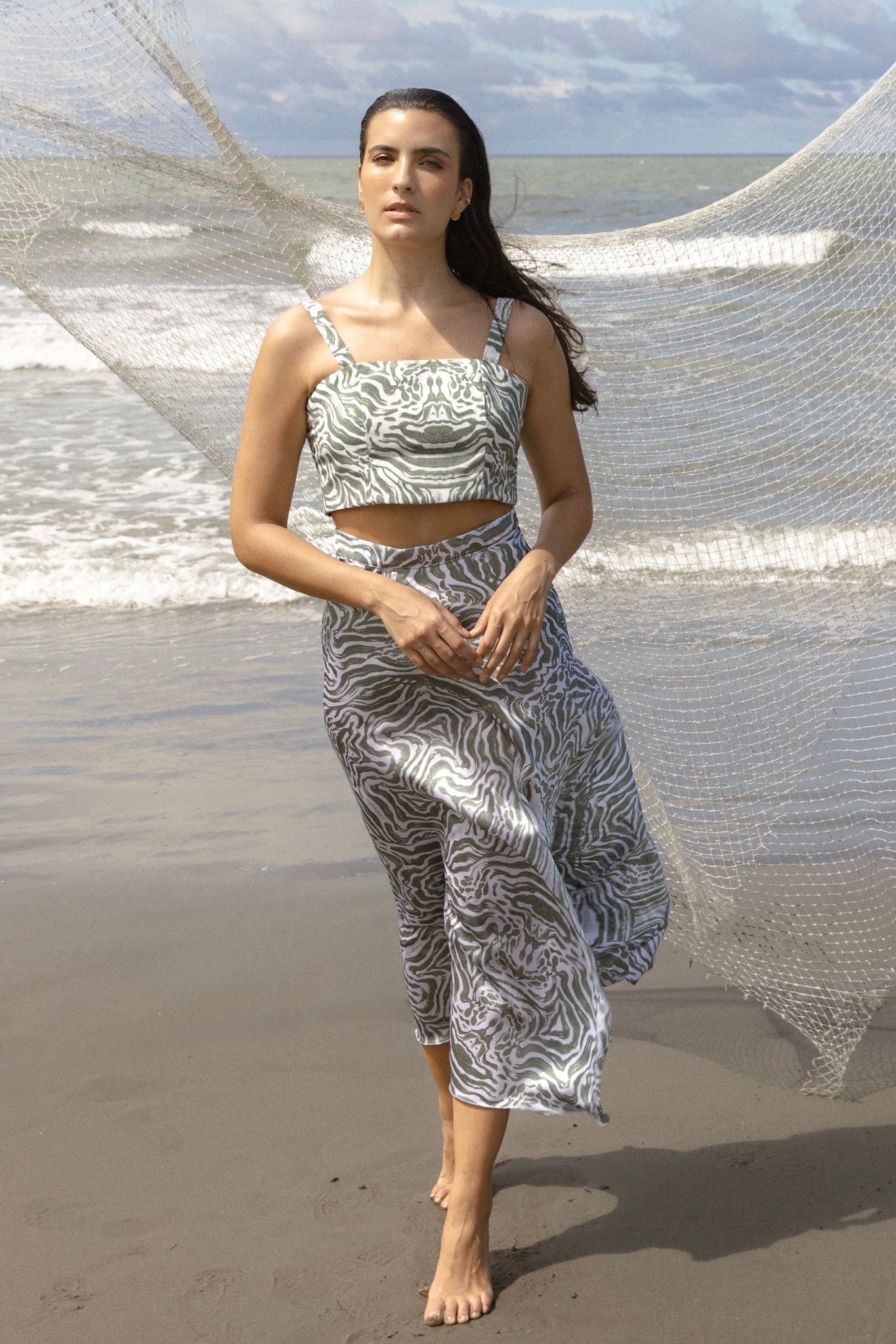 Falda larga en seda de tiro medio con una silueta fluida que aporta movimiento y ligereza. El estampado puede variar, haciéndolo único. Hecho a mano en Colombia.