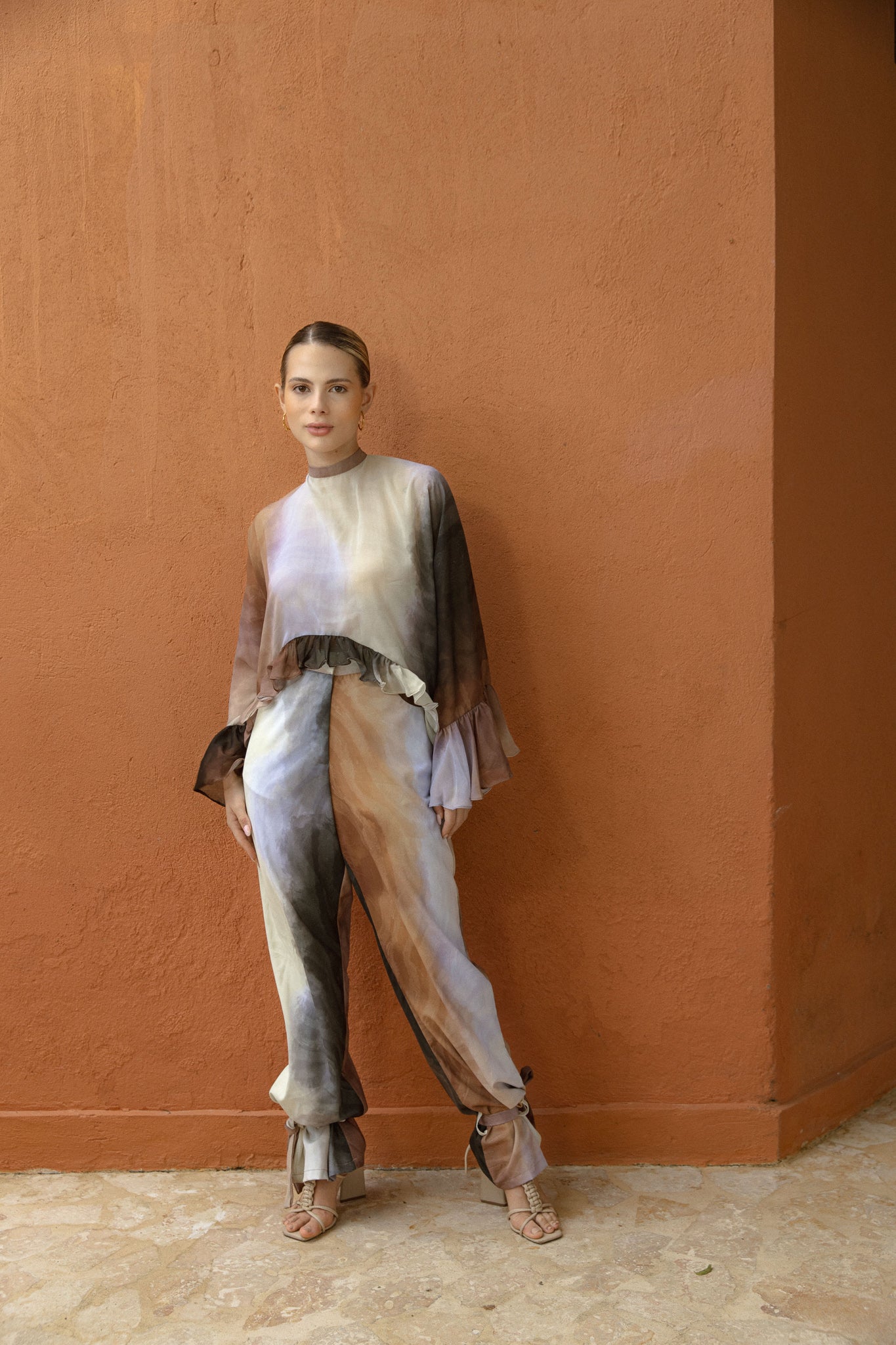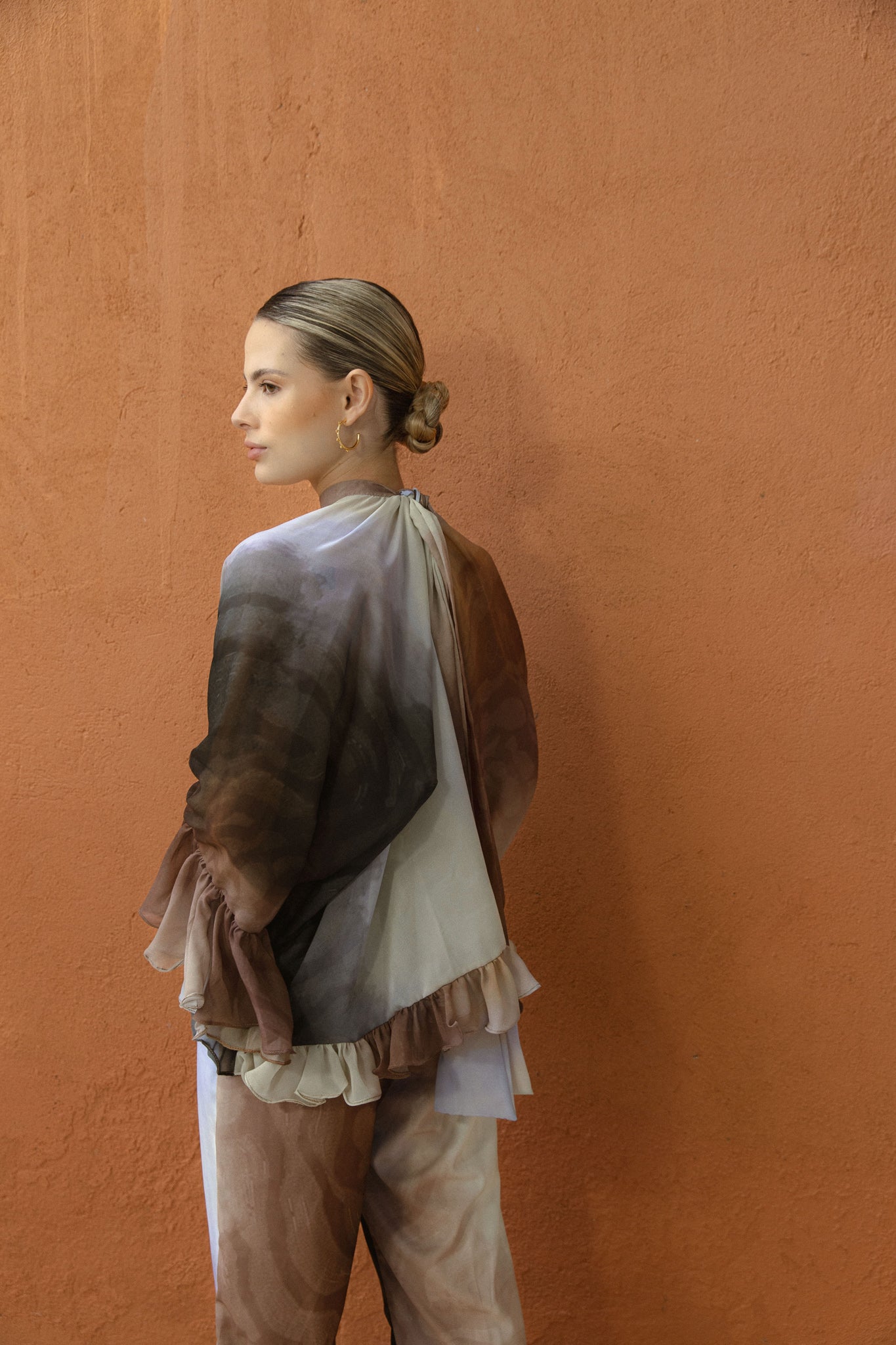 Blusa fluida en chiffon, con mangas largas amplias adornadas con volantes que aportan un toque romántico y femenino. Incluye detalles de vuelos en el bajo, que realzan el movimiento natural de la prenda. La parte posterior cuenta con un cierre en forma de lazo, que añade un acabado delicado y sofisticado.