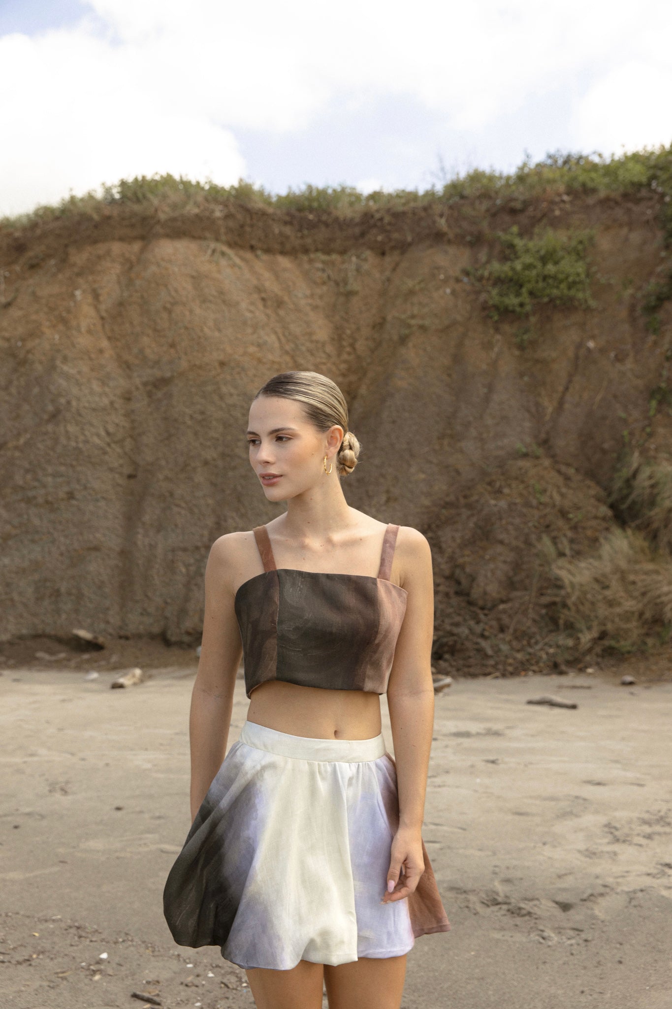 Falda corta en lino algodón de talle alto con una silueta recta que realza la figura de manera elegante. Diseñada con un acabado limpio y minimalista, incluye una cremallera invisible en la parte posterior que facilita su uso.