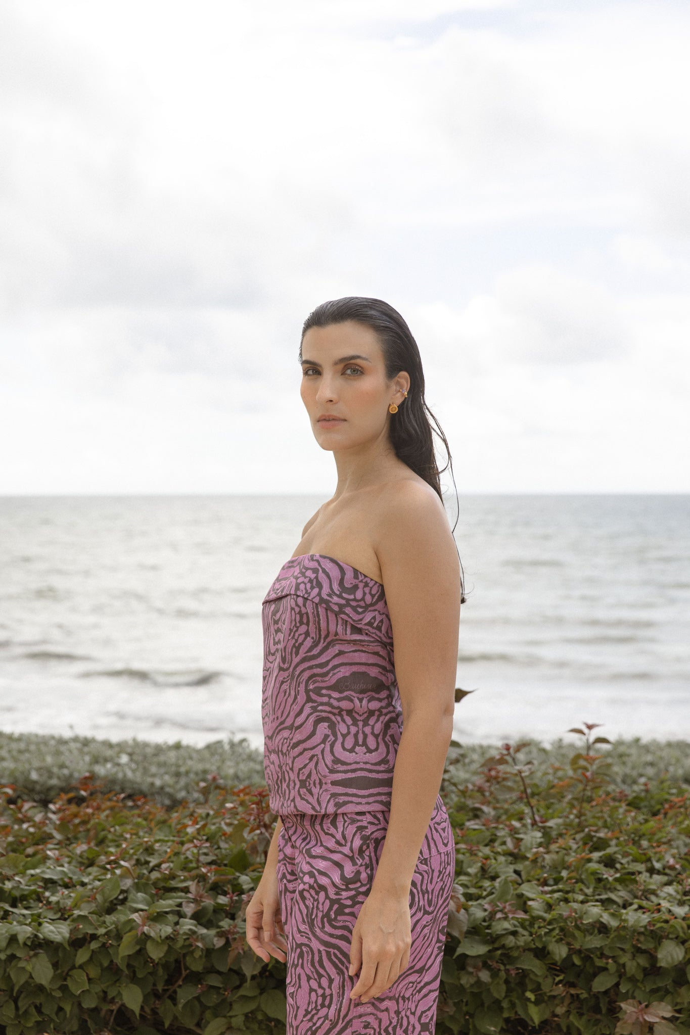 Top strapless en lino algodón con escote recto que resalta los hombros y el cuello de manera elegante y clásica.