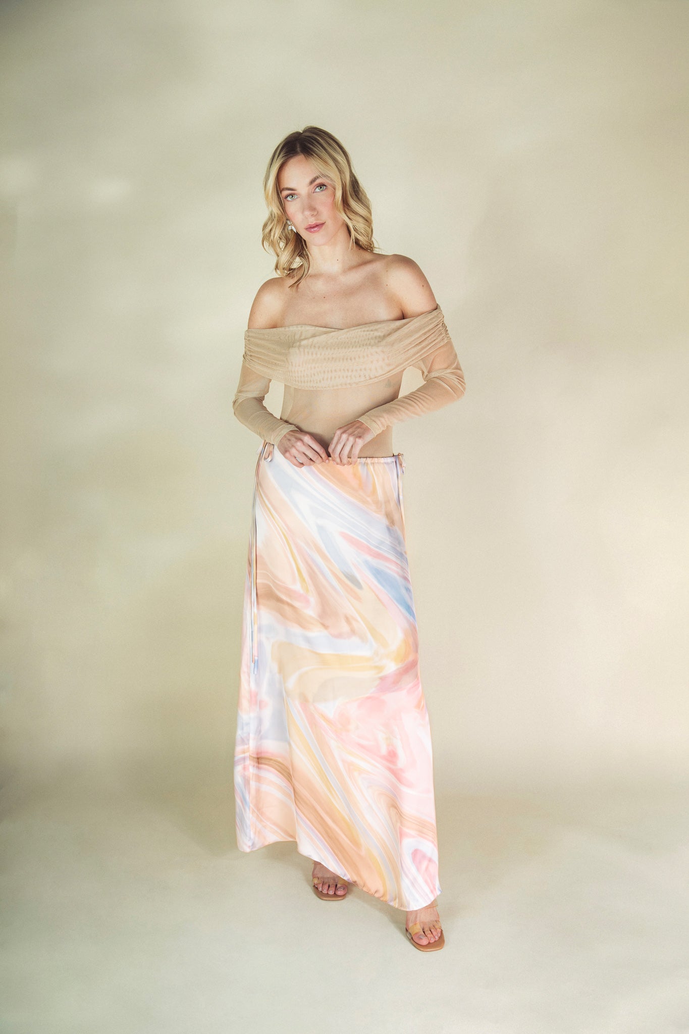 Body en mesh buttercream de manga larga con escote bandeja y detalle de fruncido en los laterales. Este diseño aporta un toque elegante y sofisticado, mientras que la tela ligera y fluida proporciona comodidad y frescura.