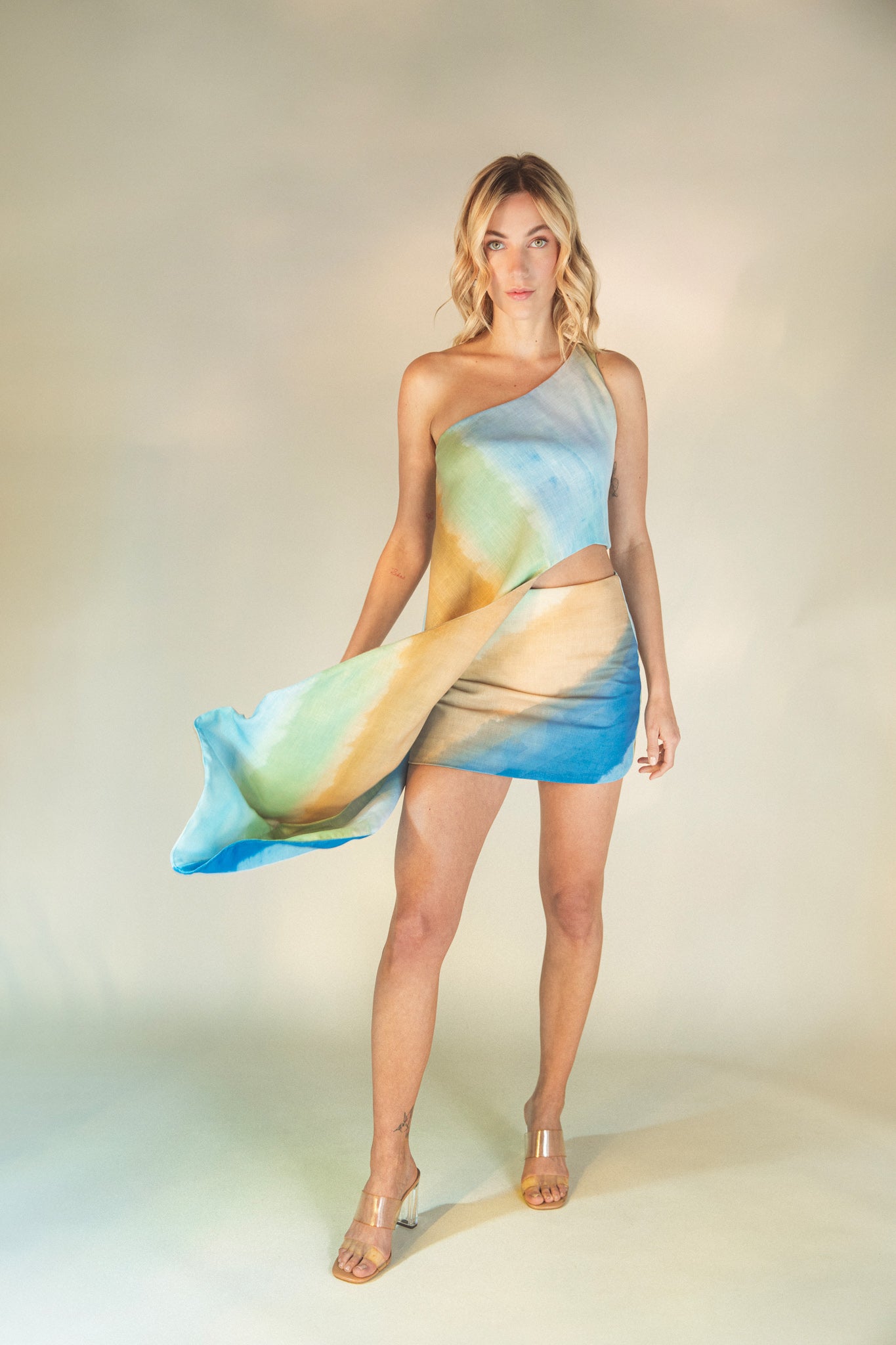 Falda corta en lino algodón de talle medio con una silueta recta que realza la figura de manera elegante. Con un estampado degradado en tonos azules, verdes y amarillos su acabado limpio y minimalista incluye una cremallera invisible en la parte posterior para mayor comodidad.