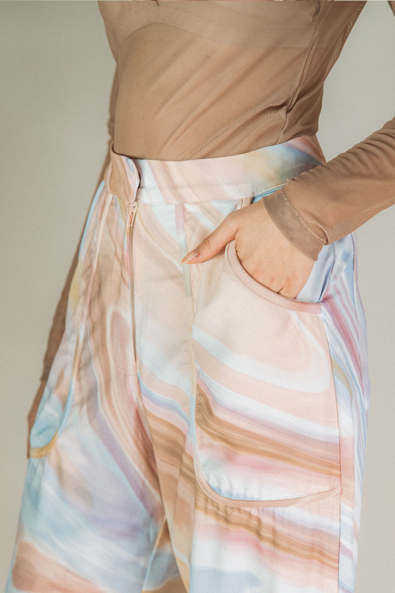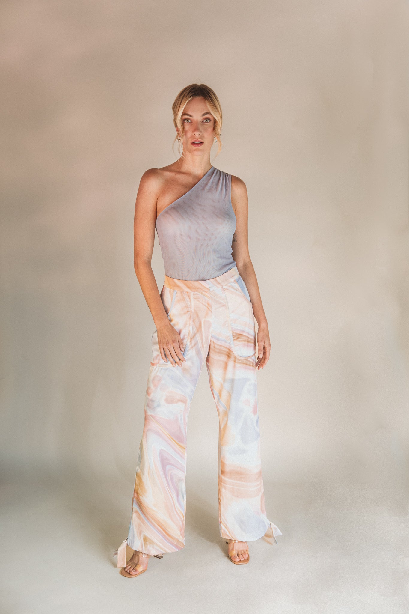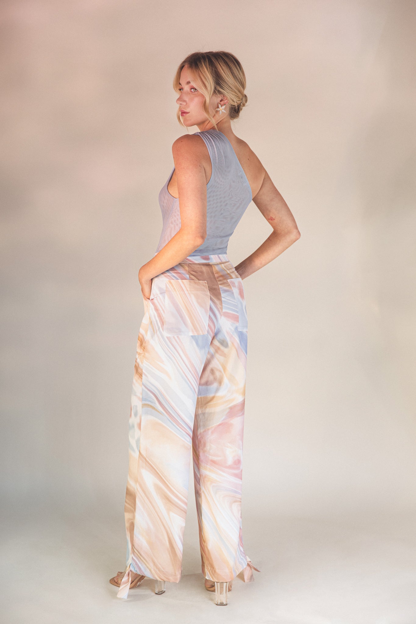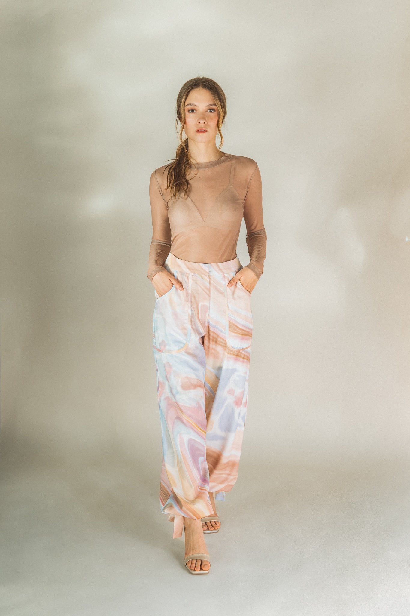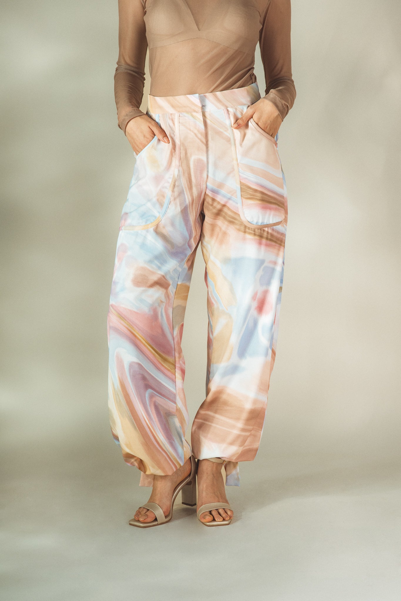 Pantalón de talle medio con silueta relajada y bolsillos laterales que aportan funcionalidad y estilo. El diseño incluye lazos ajustables en los tobillos que permiten personalizar el ajuste, añadiendo un detalle único al look.