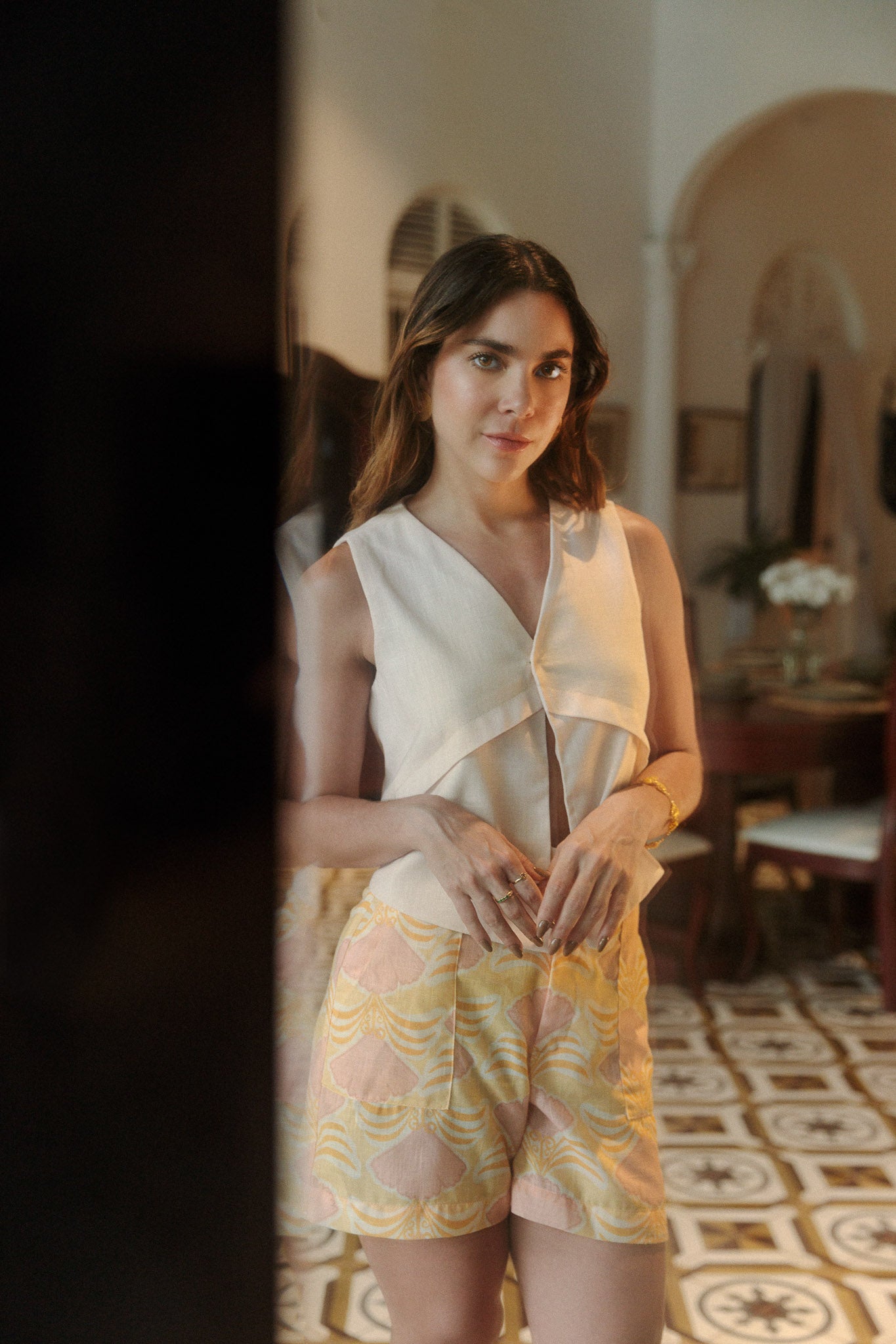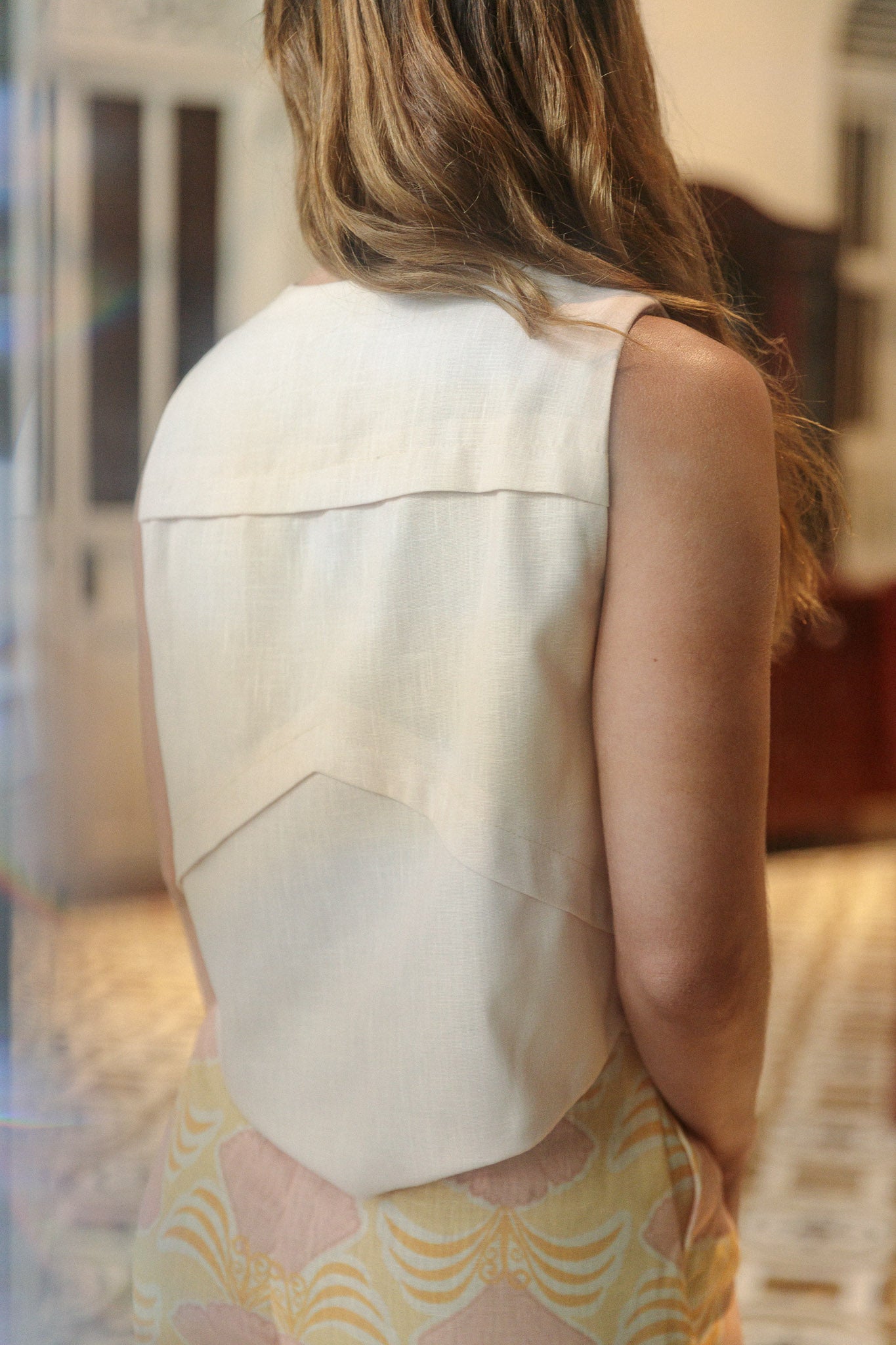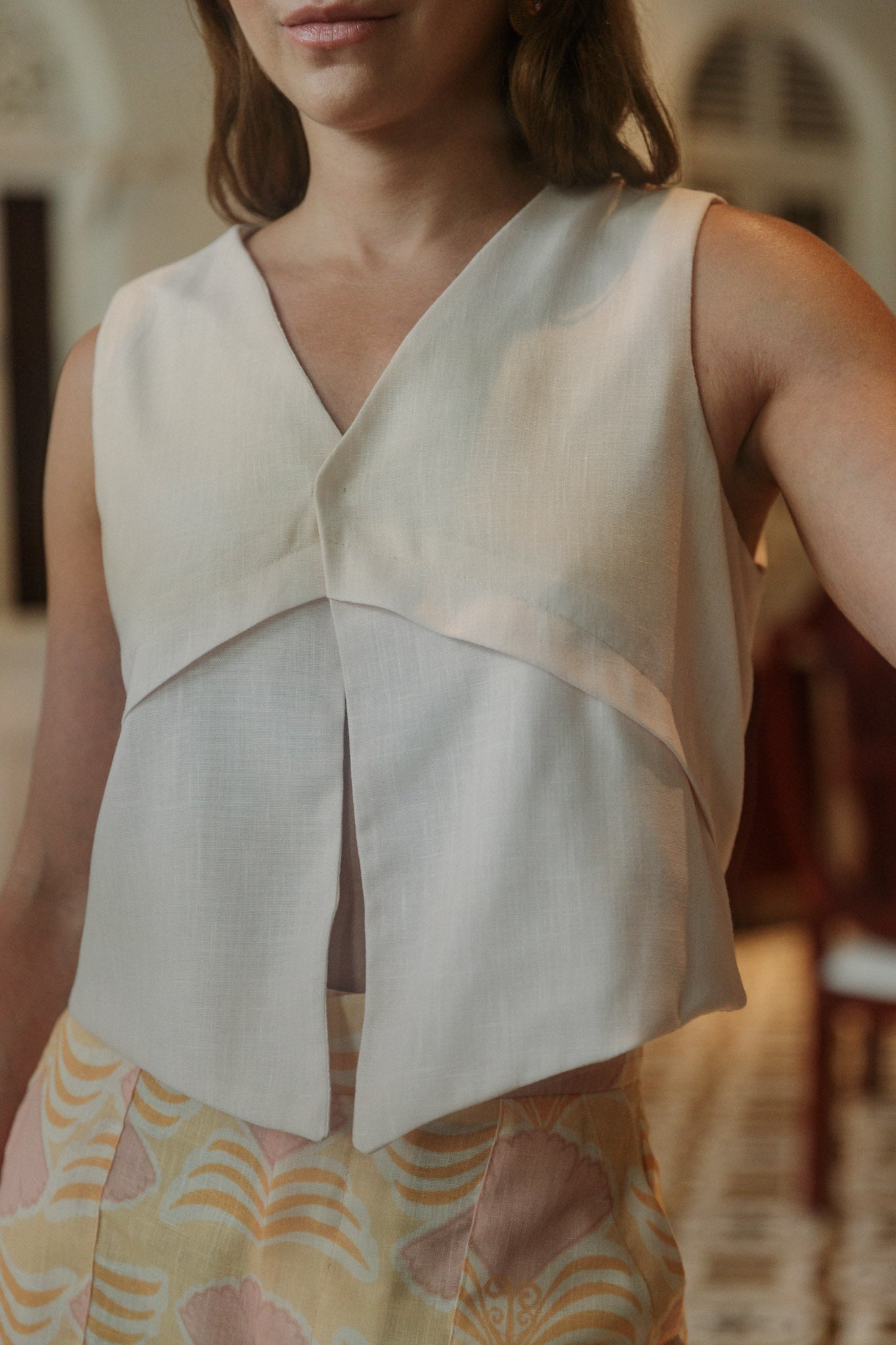 Vest sin mangas en lino rosa, con cortes geométricos y cierre de broche interno delantero. Diseñado para ofrecerte un look casual y sofisticado, puedes combinarlo con nuestro Caoba Short.