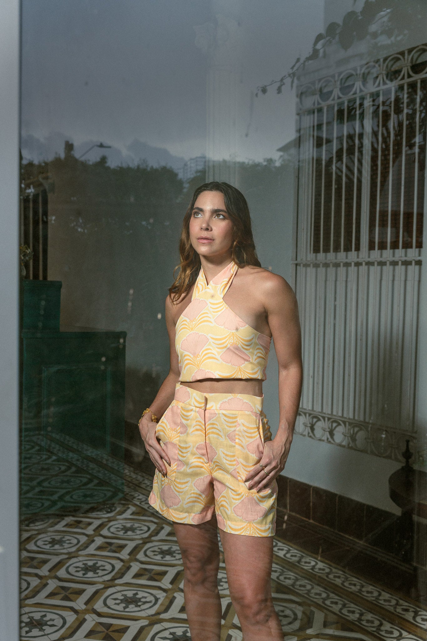 Top con cuello tipo halter, con estampado de shells, detalle de smocking en la espalda para un ajuste perfecto y un encantador lazo en la parte posterior. Perfecto para un look fresco y sofisticado puedes combinarlo con nuestro Caoba Short.