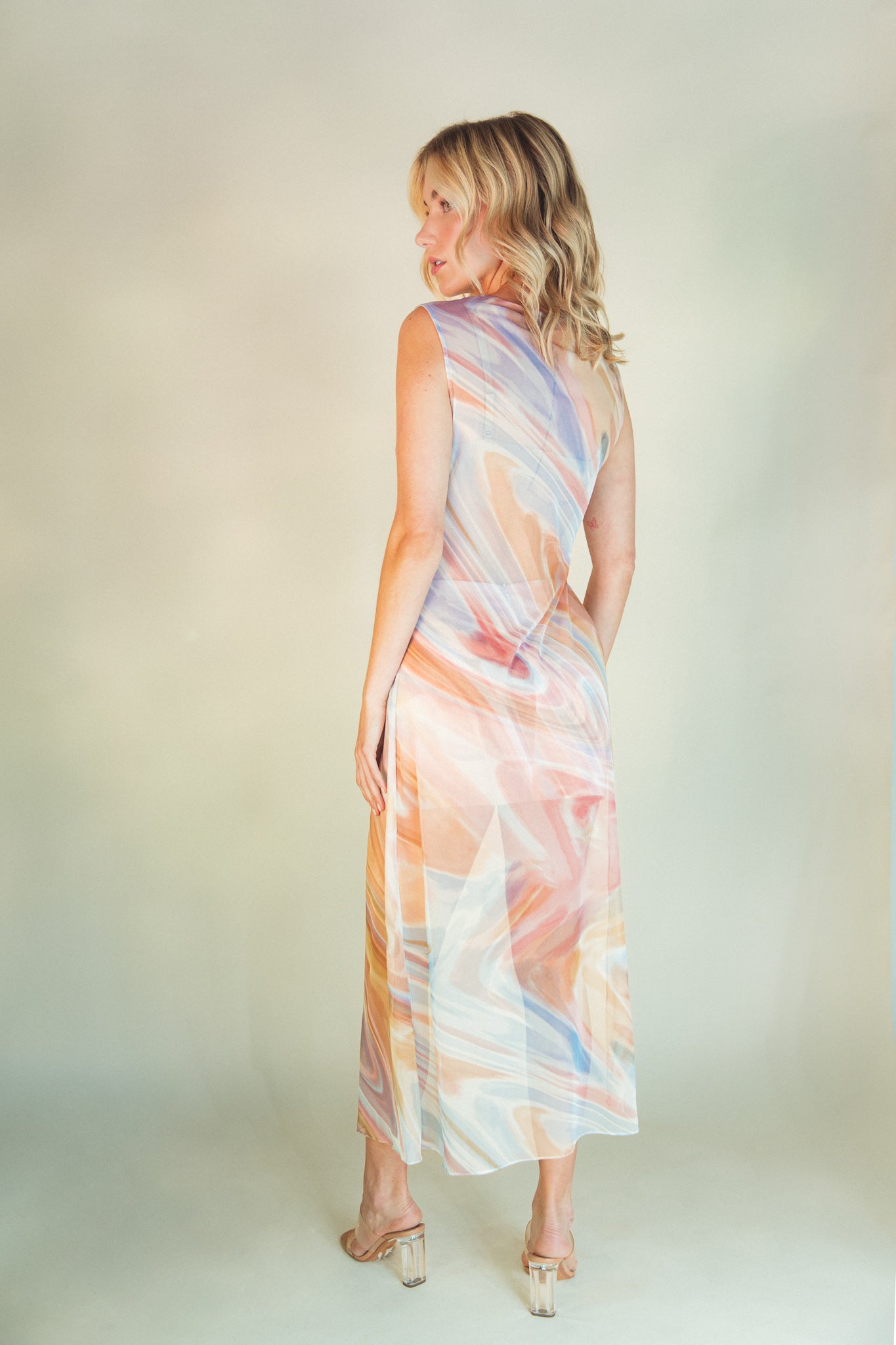 Top largo en mesh sin mangas con escote redondo. El diseño fluido y elegante, con un estampado abstracto en tonos pastel, aporta un toque fresco y sofisticado.