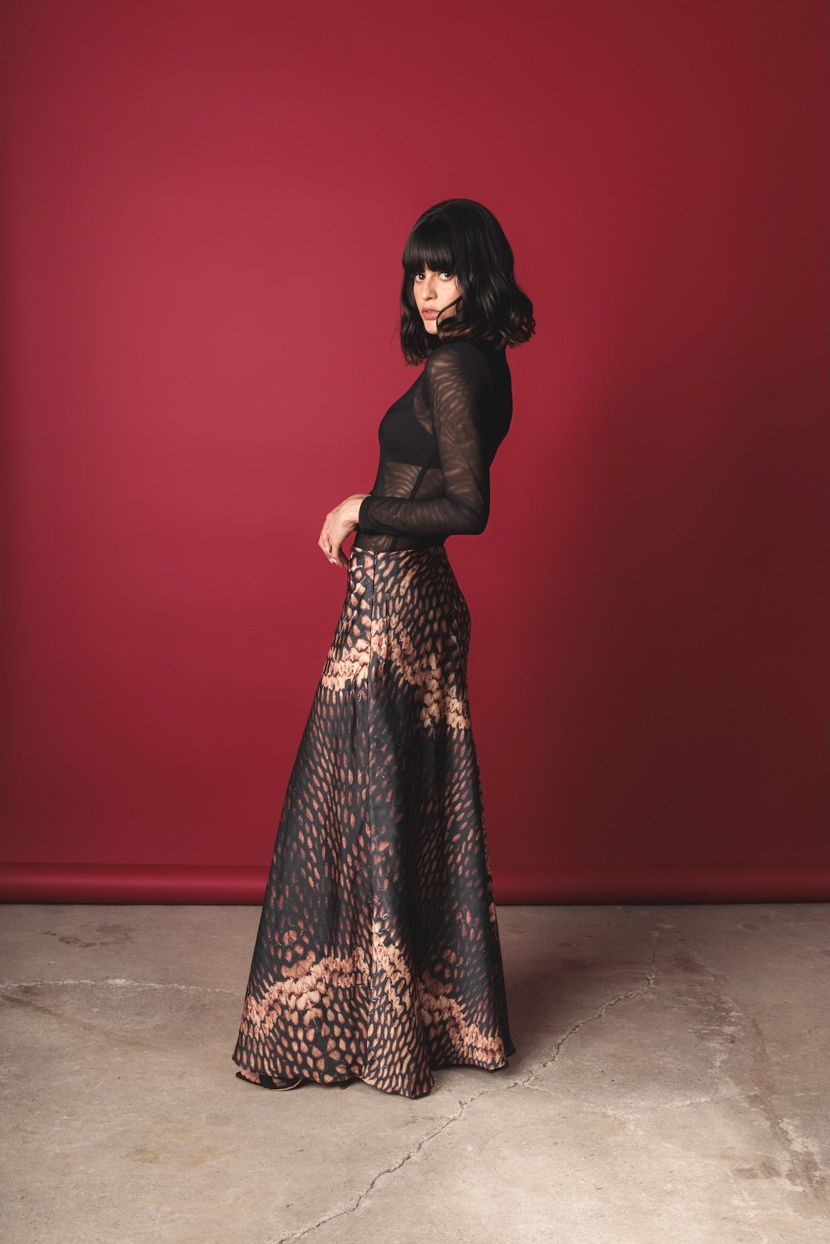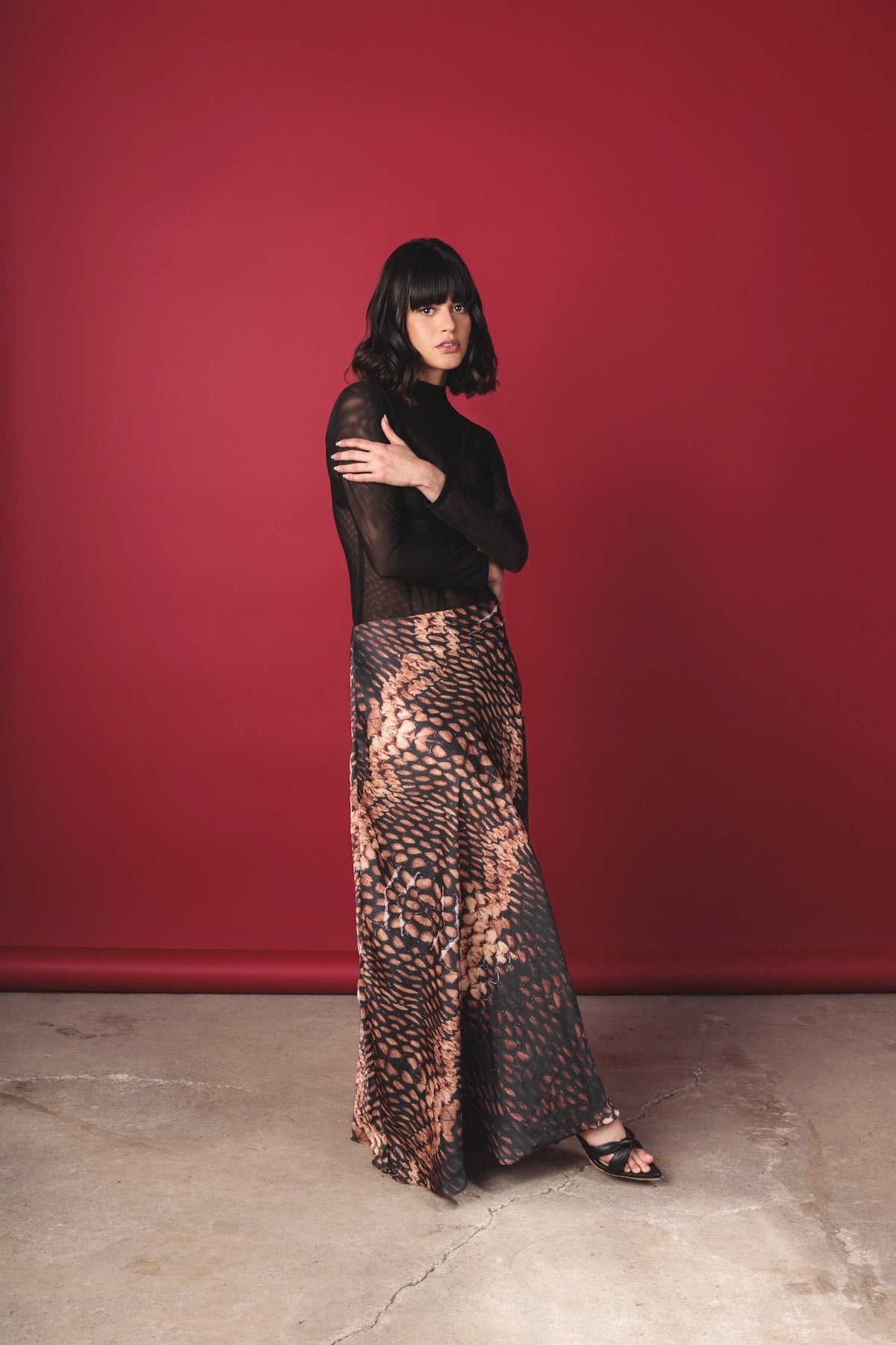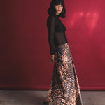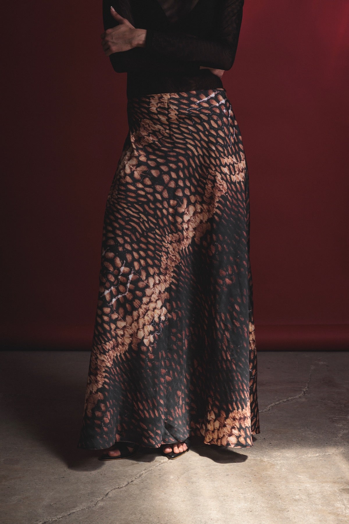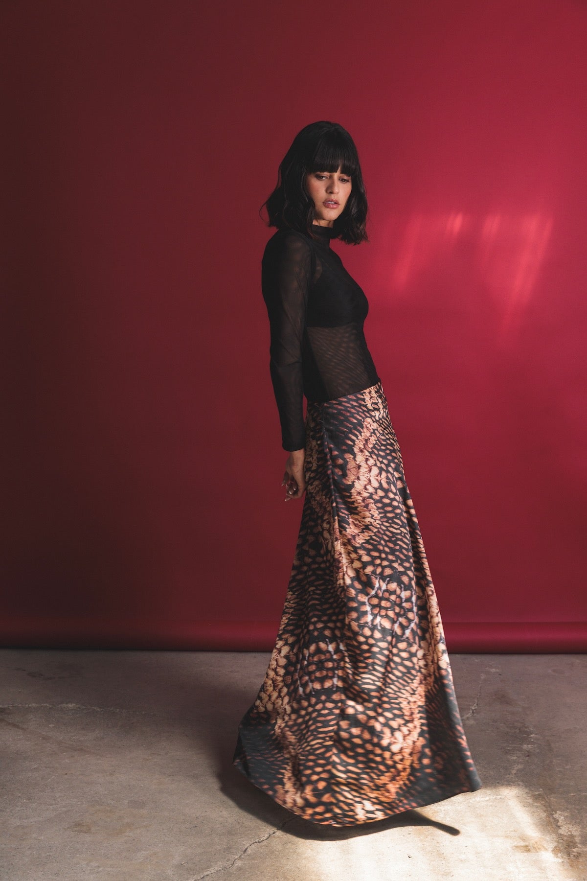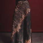 Falda larga de tiro medio confeccionada en seda con estampado tipo serpiente en tonos negro, caramelo y beige. Su silueta amplia y fluida aporta elegancia y movimiento. Cuenta con cierre lateral invisible para un acabado limpio y sofisticado.
