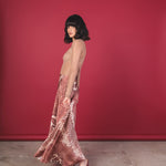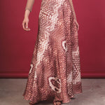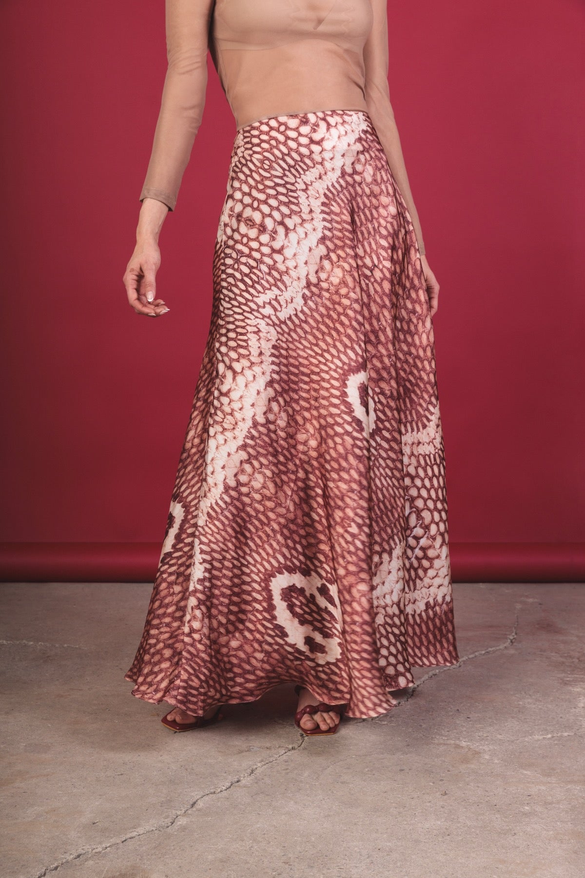 Falda larga de tiro medio confeccionada en seda con estampado tipo serpiente en tonos terracota y crema. Su silueta amplia y fluida aporta elegancia y movimiento. Cuenta con cierre lateral invisible para un acabado limpio y sofisticado.