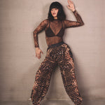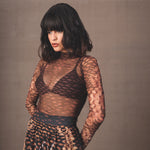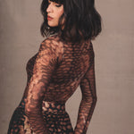 Top de malla manga larga, Presenta un estampado tipo serpiente en tonos caramelo y negro. Su silueta ajustada resalta la figura, mientras que el cuello alto aporta un toque elegante y equilibrado.