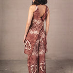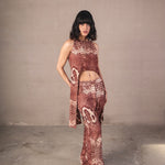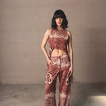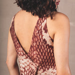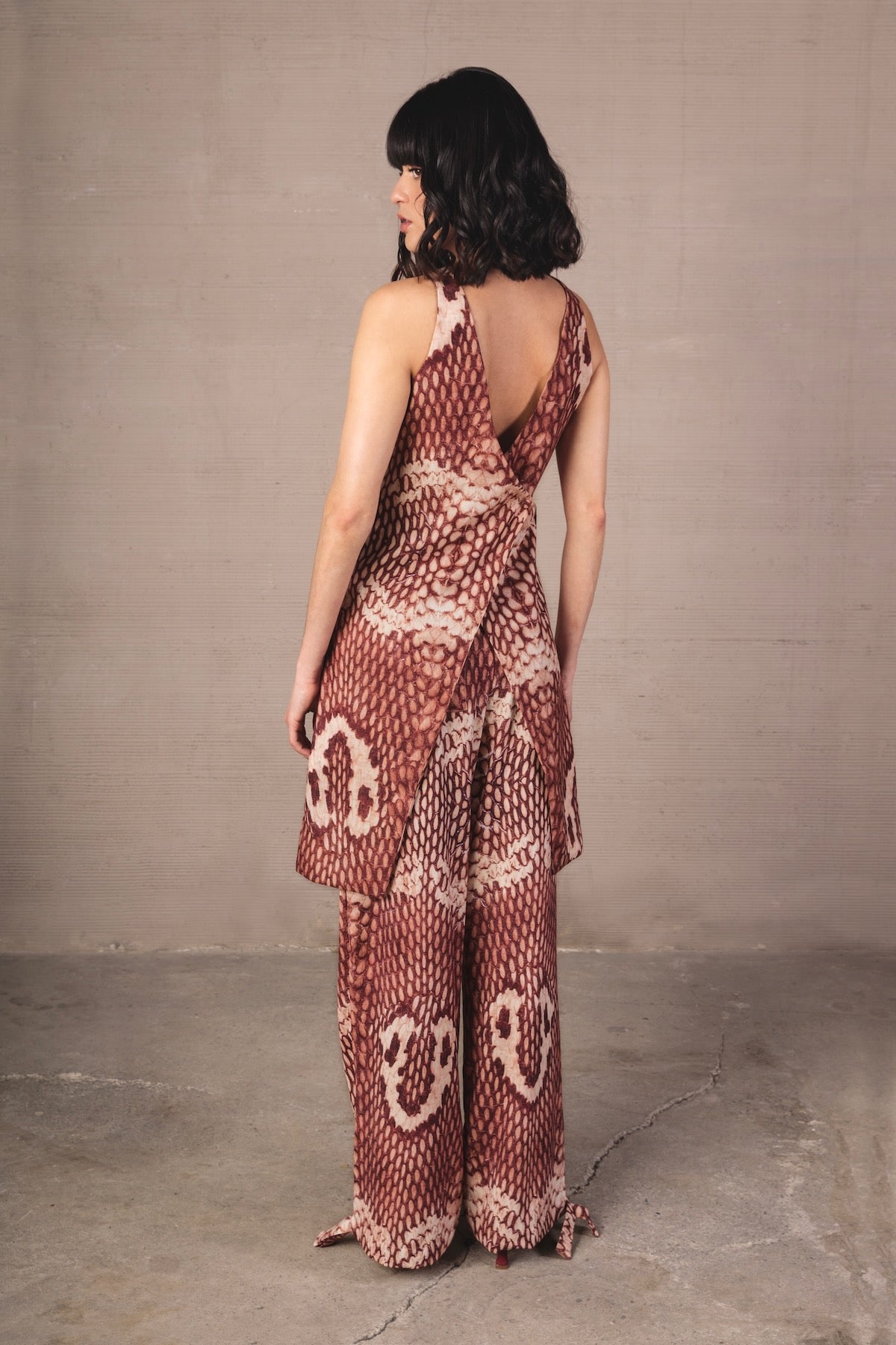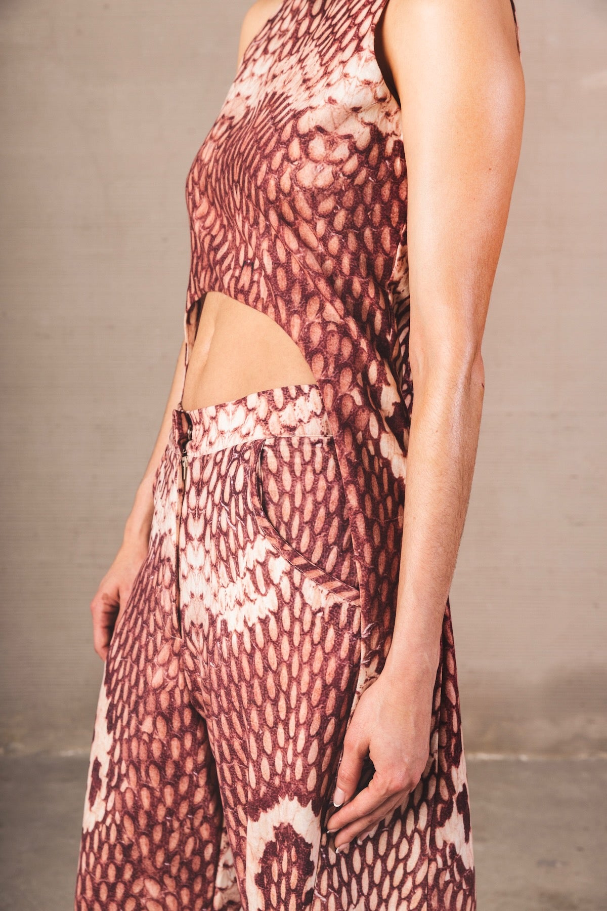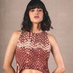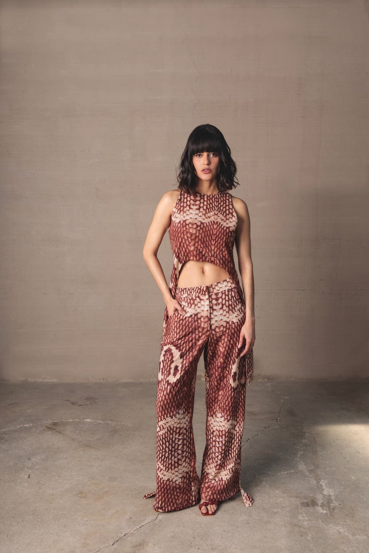Top asimétrico sin mangas, con estampado tipo serpiente en tonos terracota y crema. Su diseño incluye una abertura frontal curva que revela sutilmente la cintura y una caída lateral prolongada que crea un efecto de túnica corta.
