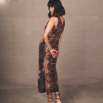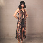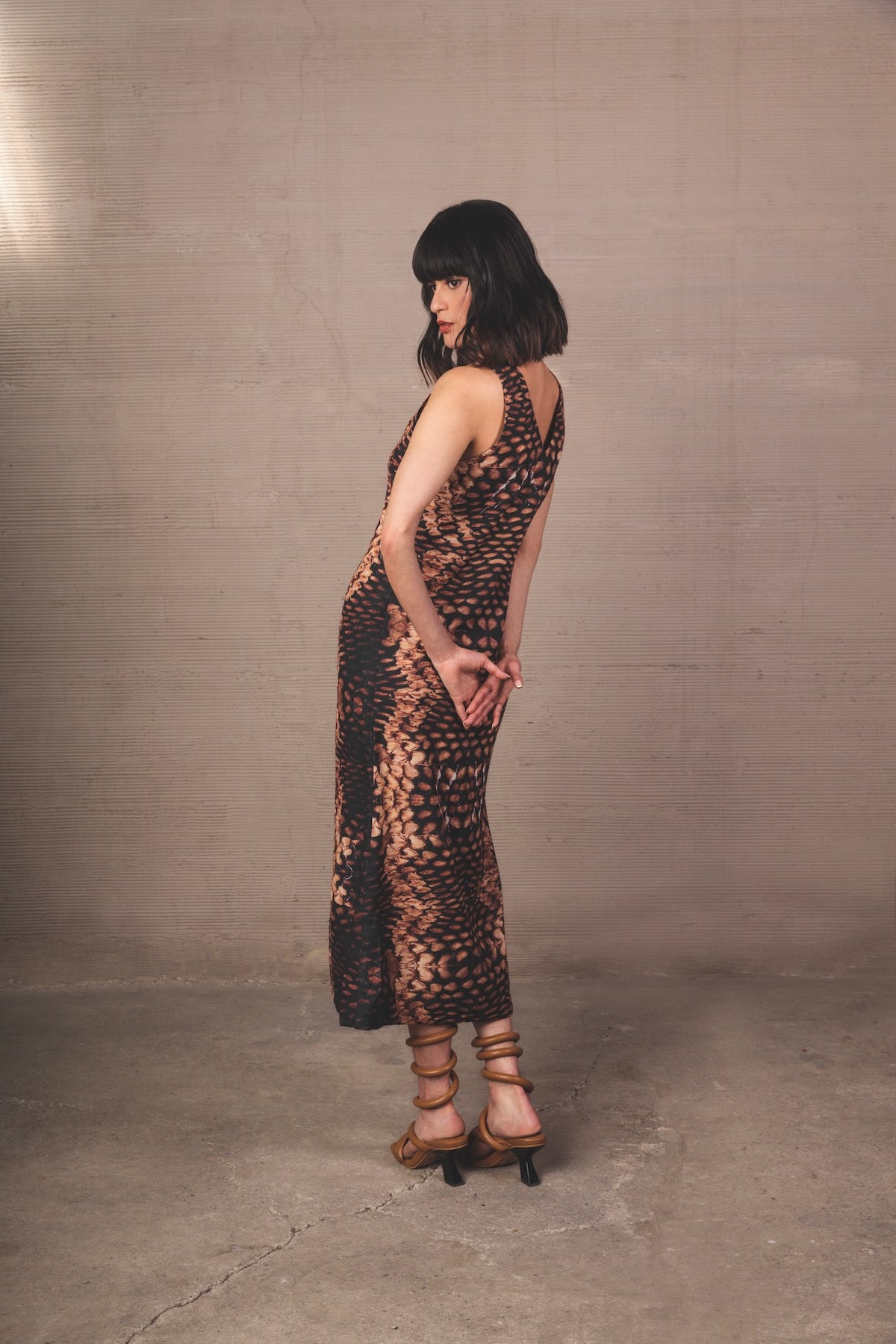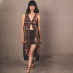 Top largo sin mangas con escote en V y abertura frontal, con estampado tipo serpiente en tonos en tonos en tonos negro, caramelo y beige. Caída fluida y silueta moderna.